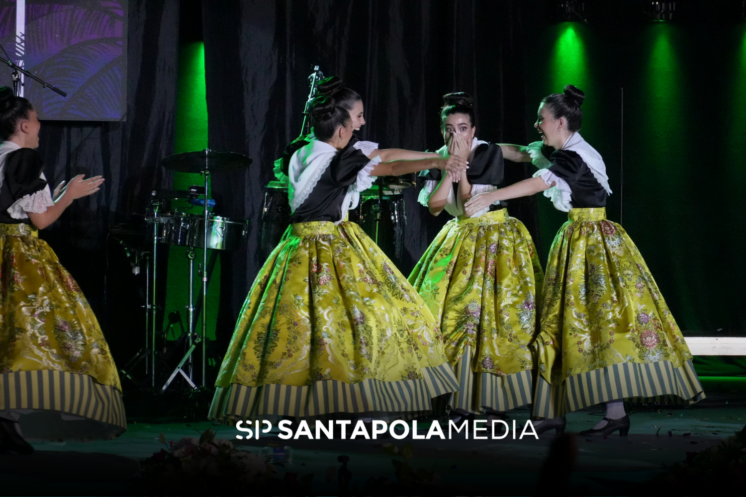 A continuación las cinco candidatas volvieron a desfilar por el escenario, esta vez vestidas con el típico traje regional, y antes de despedirse contestaron cada una a una pregunta relacionada con la fiesta, con la que pudieron expresar sus sentimientos festeros.